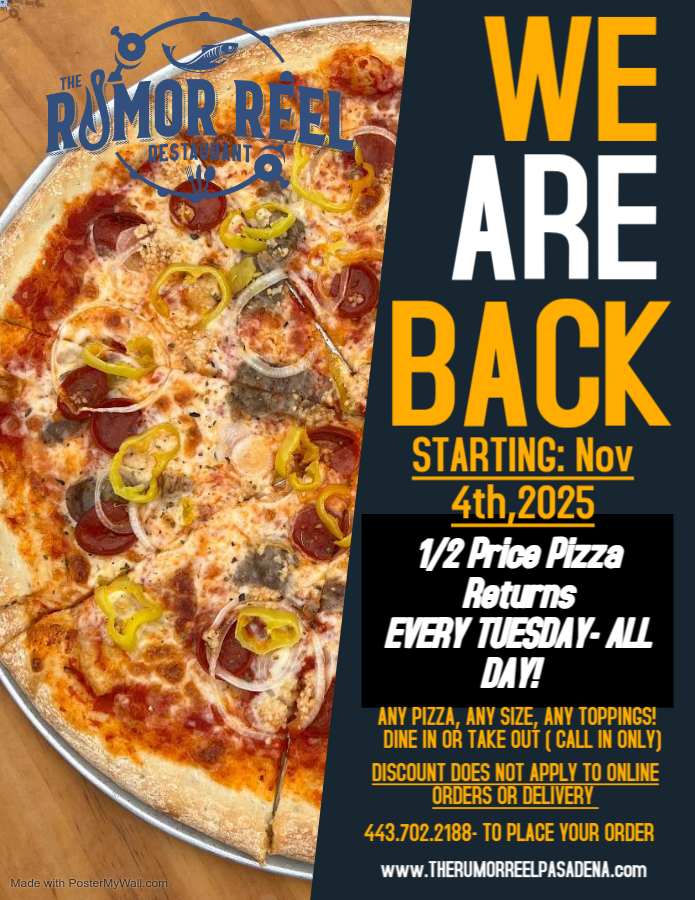 Half-price pizzas on Tuesdays. All day. Not available for online ordering. Call in for pick up.