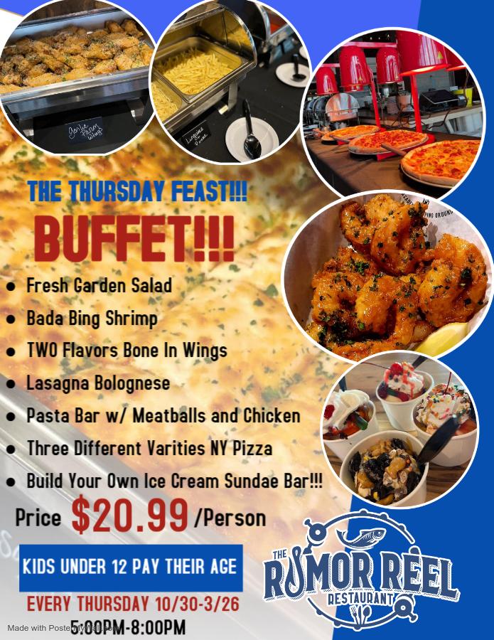 Join us for all you can eat wings, pizza, and pasta bar, with a sundae bar!